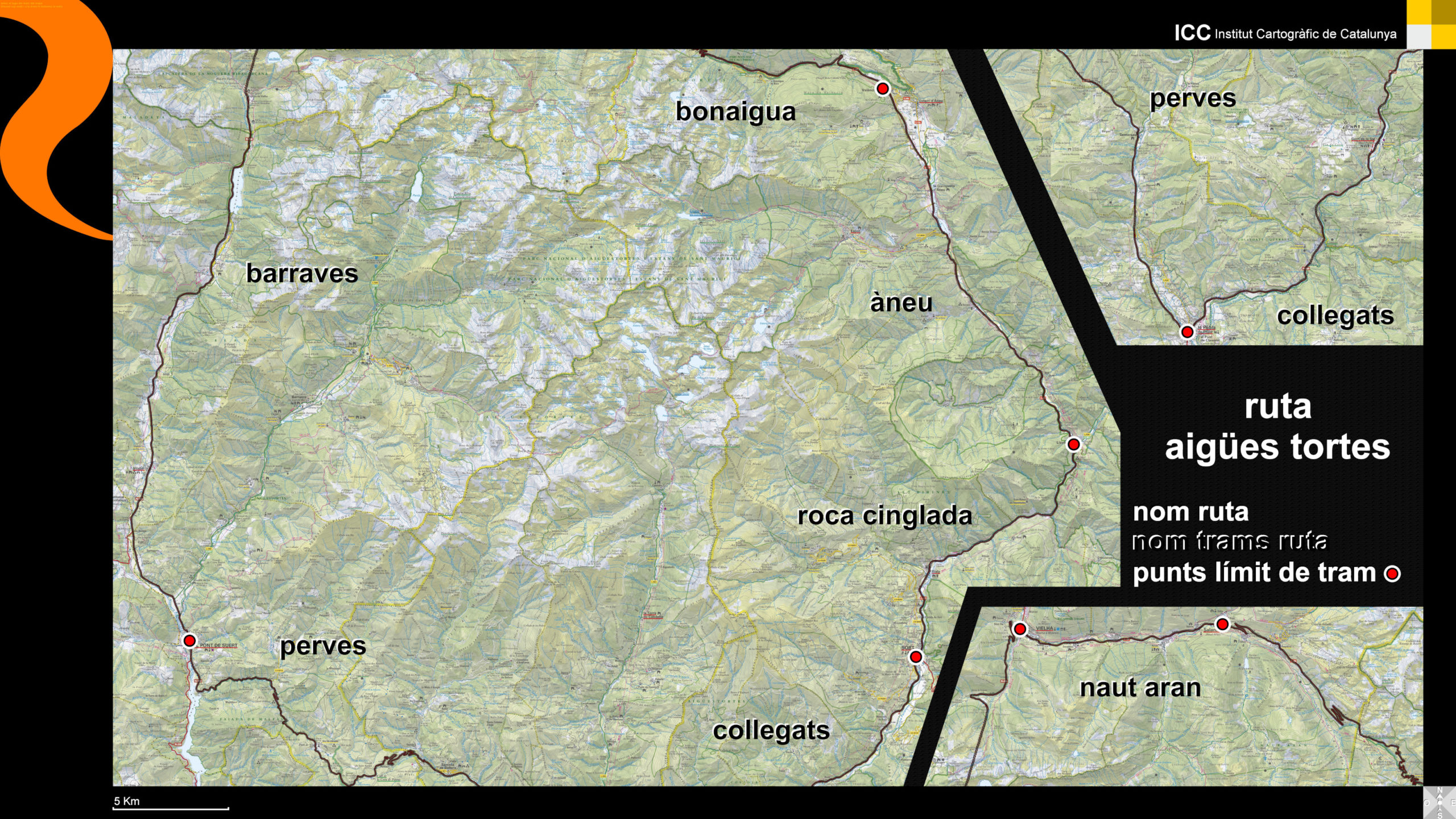 La ruta describe una vuelta al entorno del Parque Nacional de Aigües Tortes y Lago de San Mauricio.