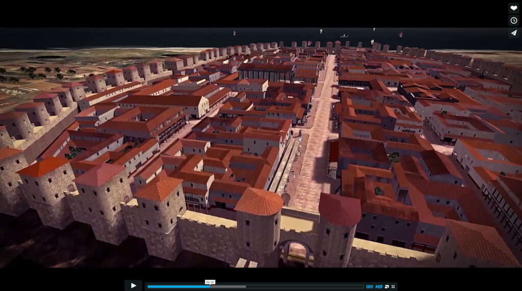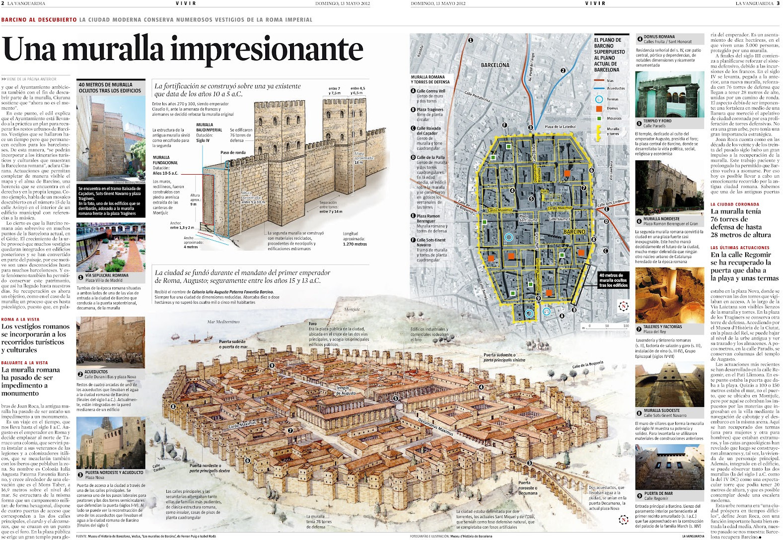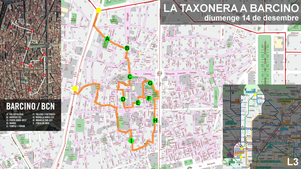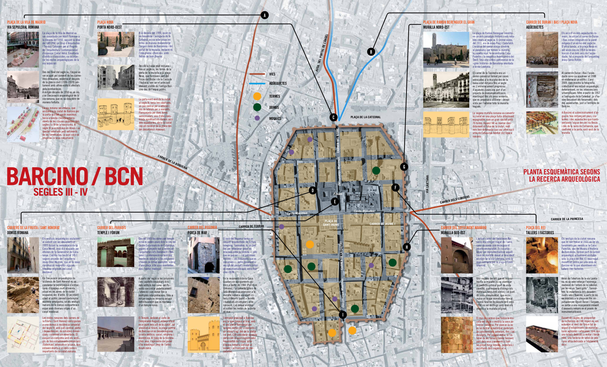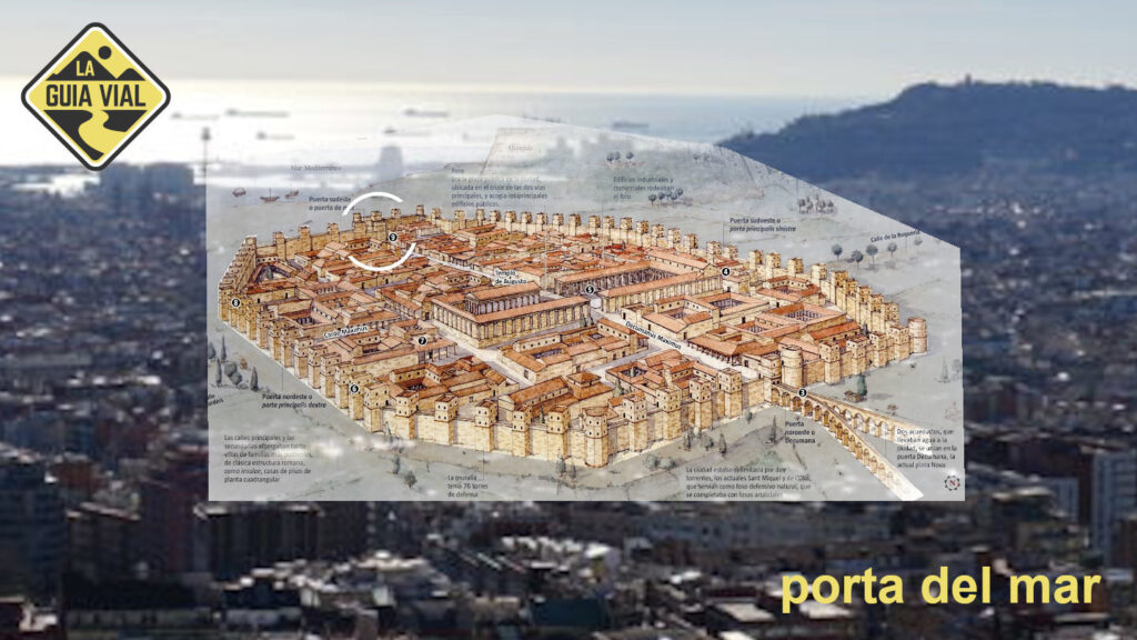 Aquesta estructura es pot resseguir encara avui dia: el carrer de la Llibreteria, que neix a la plaça de l’Àngel, on hi havia la Porta Sinistra de les muralles, és l’antic cardus que creuava la ciutat de nord a sud, fins a l’anomenada Porta Dextra, al final de l’actual carrer del Call; la plaça de Sant Jaume, al centre, s’estén una mica més al sud-est d’on aleshores hi havia el Fòrum; i els carrers del Bisbe, de la Ciutat i del Regomir ressegueixen l’antic decumanus des de la Porta Praetoria, a l’oest, fins a la Porta Decumana o porta del Mar, a l’est.
